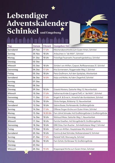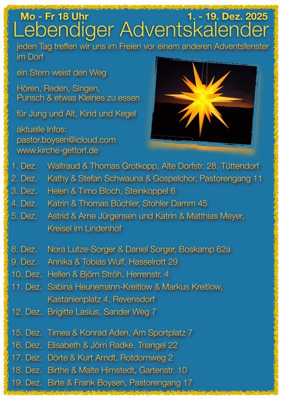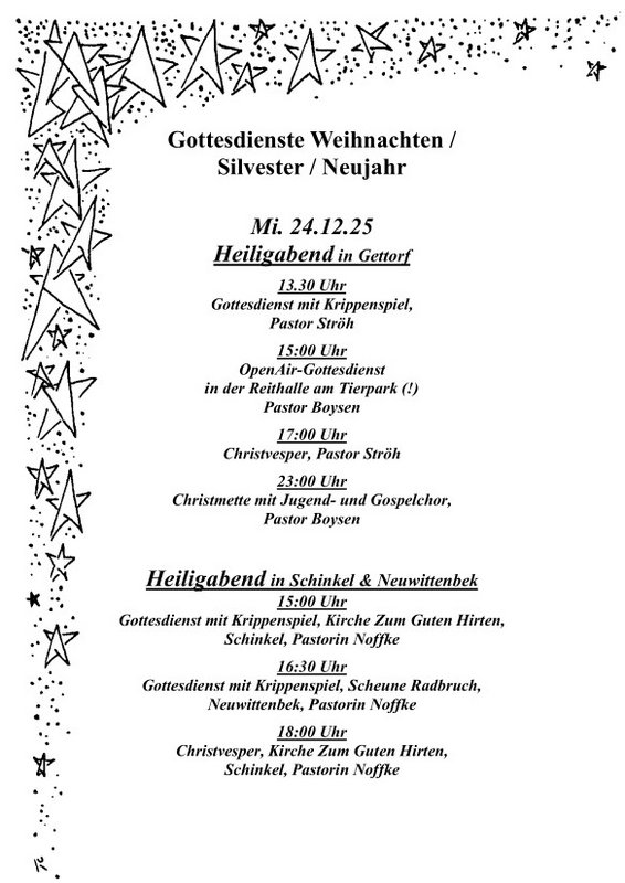 Unsere Kirchengemeinde erstreckt sich über die Dörfer: Altenhof, Gettorf, Lindau, Neudorf-Bornstein, Neuwittenbek, Schinkel, Tüttendorf. | |