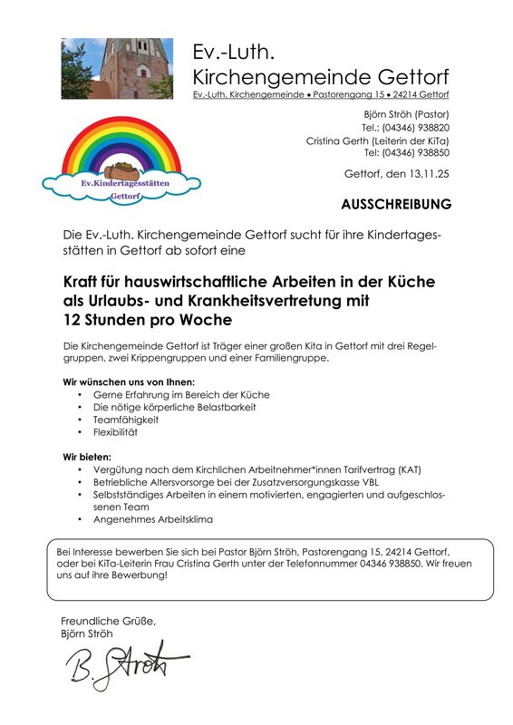 Die Ev.-Luth. Kirchengemeinde Gettorf sucht für ihre Kindertagesstätten in Gettorf ab sofort eine